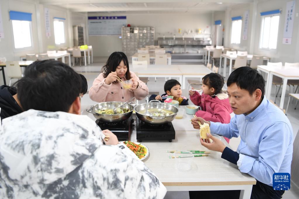 1月19日,李辉(右一)一家和项目部其他留守人员一同吃午饭。