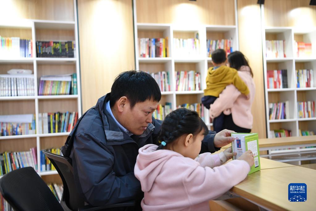 1月18日,李辉(左一)陪着女儿在项目部阅览室内读书。