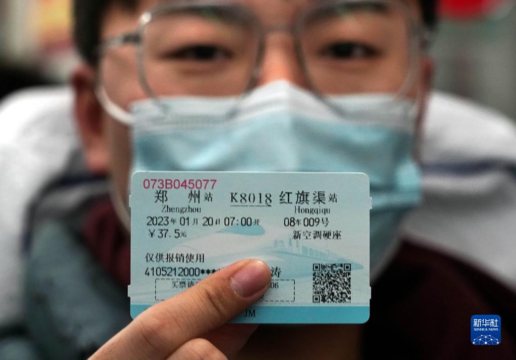 1月20日,旅客在首趟“红旗渠”号列车上展示车票。