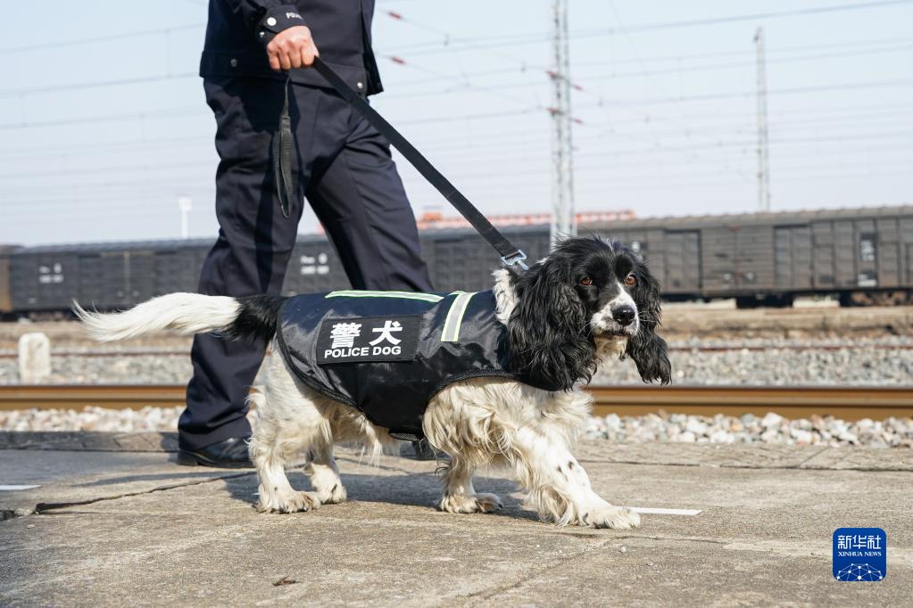 1月18日,警犬“和平”在民警王支斌的带领下在车站内巡逻。