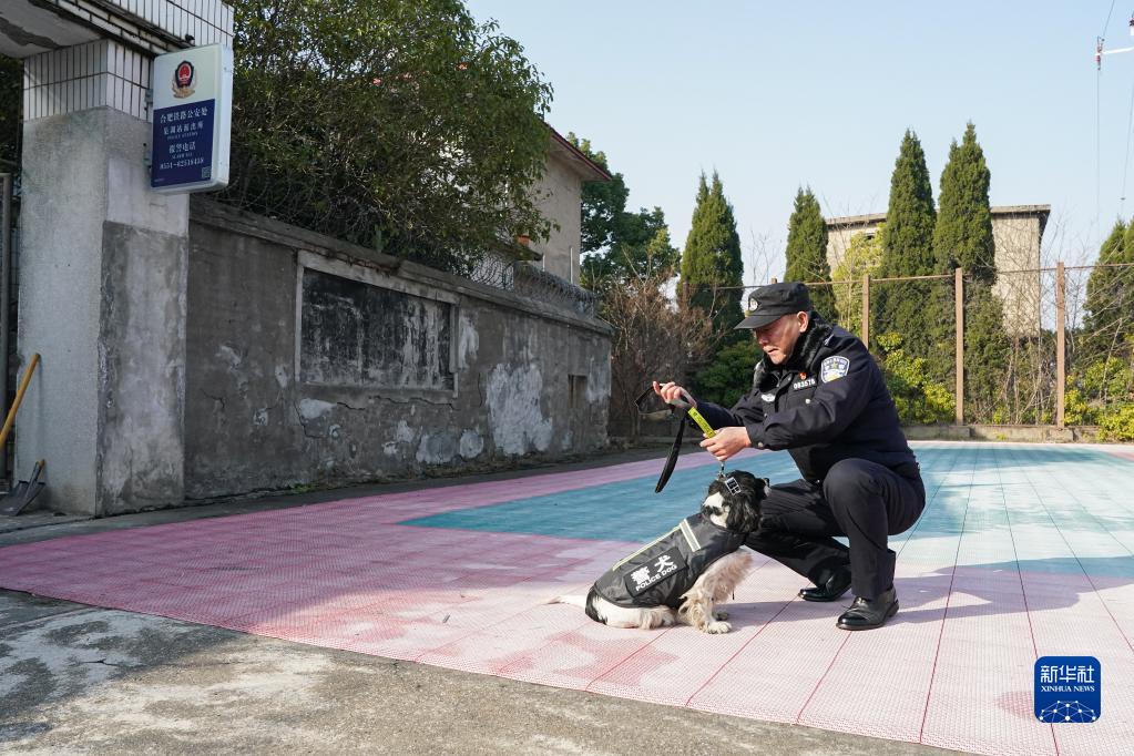 1月18日,民警王支斌为警犬“和平”在裕溪口警务室前整理警犬服。