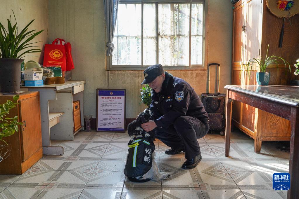 1月18日,民警王支斌和警犬“和平”在裕溪口警务室内互动。