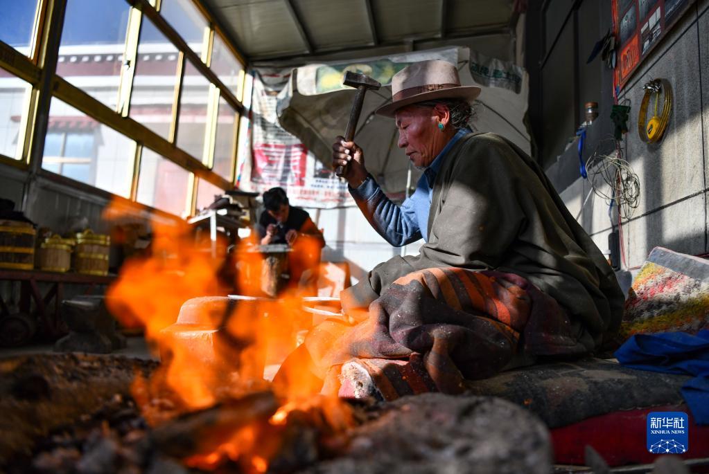 普达瓦在制作拉孜藏刀(1月19日摄)。