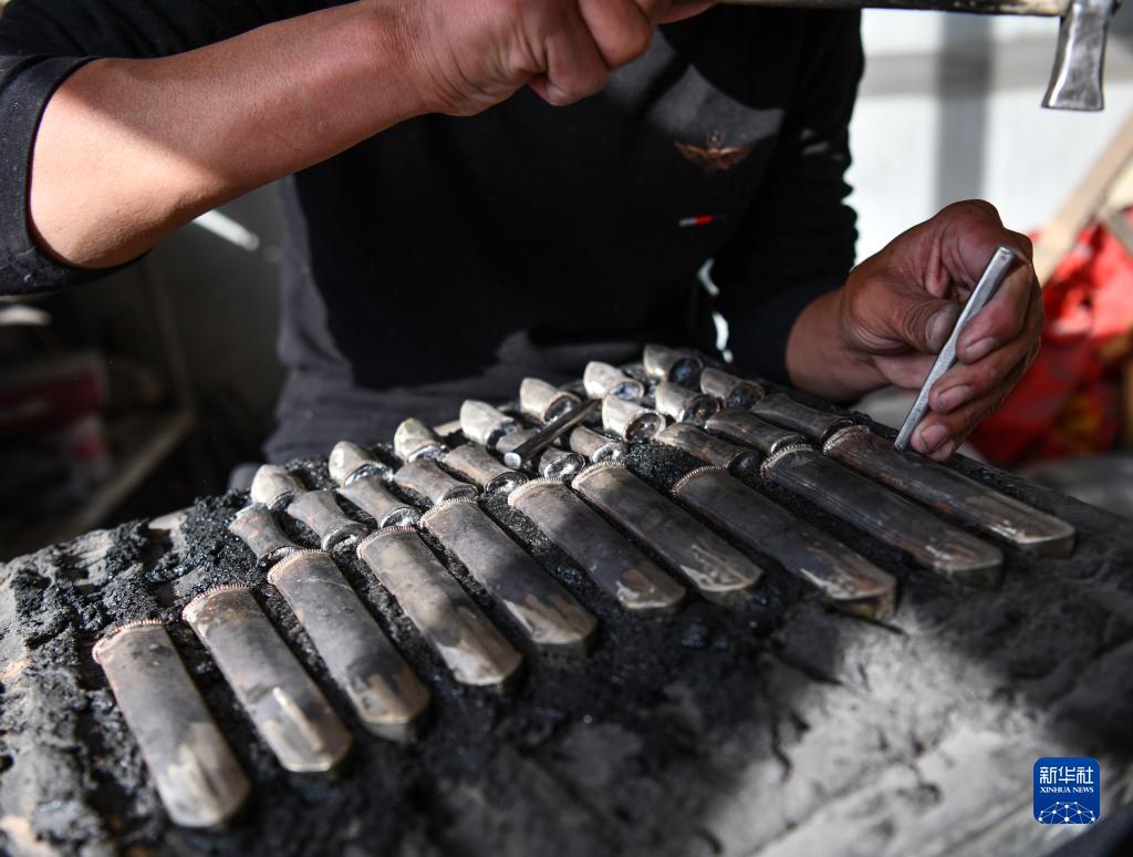 多吉占堆在雕刻拉孜藏刀上的花纹(1月19日摄)。