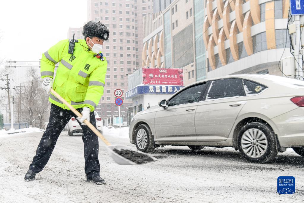 1月21日,在位于乌鲁木齐市的北园春副食海鲜市场附近,民警阿拉法特·胡加何买提在路面上抛洒炉渣,以防车辆打滑。
