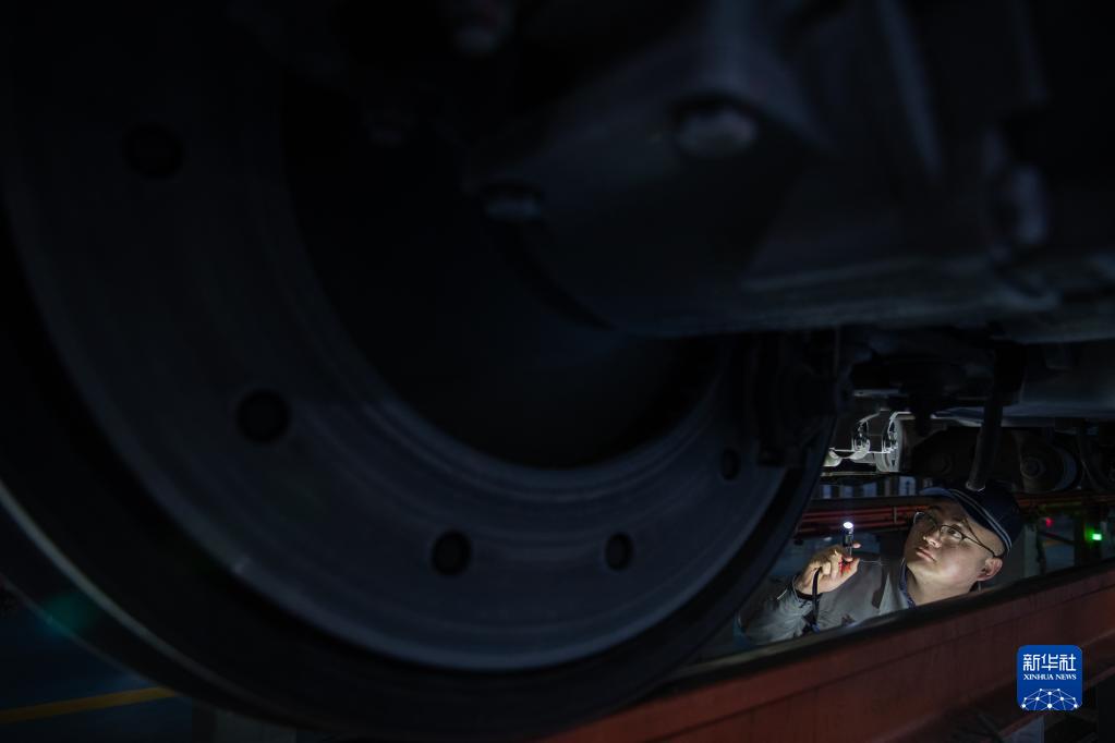 1月21日,在中国铁路哈尔滨局集团有限公司哈尔滨动车段检修车间,地勤机械师苗壮检查车辆。