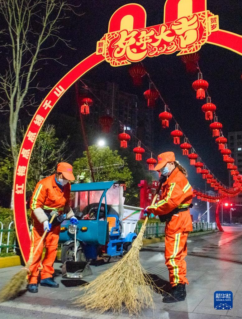 1月21日,在安徽省芜湖市繁昌区繁阳镇渡江大道上,环卫工人在进行保洁作业。