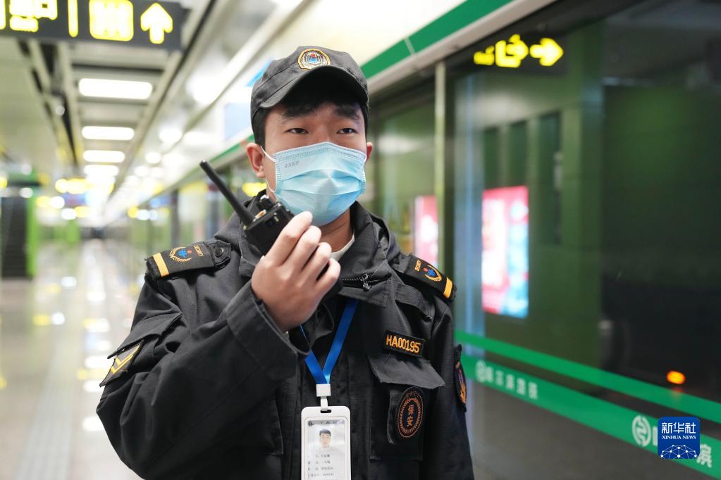 1月21日,在哈尔滨地铁2号线省医院站,站台保安付延楠坚守岗位。