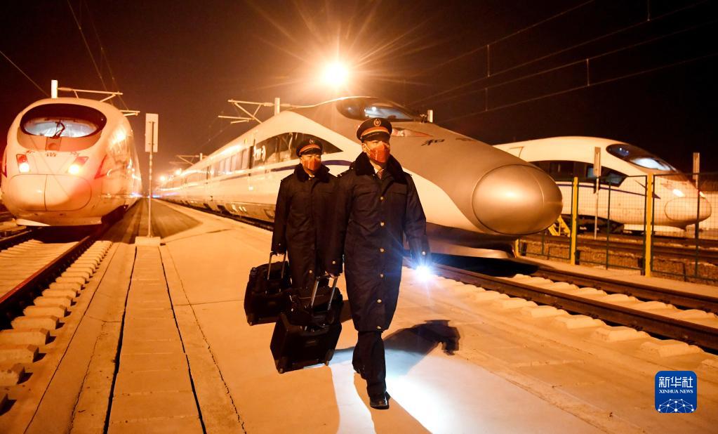 1月21日凌晨,在河南省洛阳市动车组存车场,洛阳机务段高铁司机准备上车出勤。