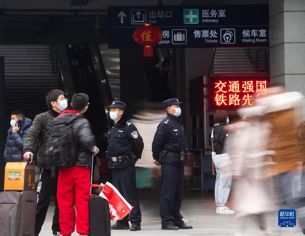 1月21日,民警王劲松(右)与同事刘小龙在湖北省宜昌东站出站口执勤。