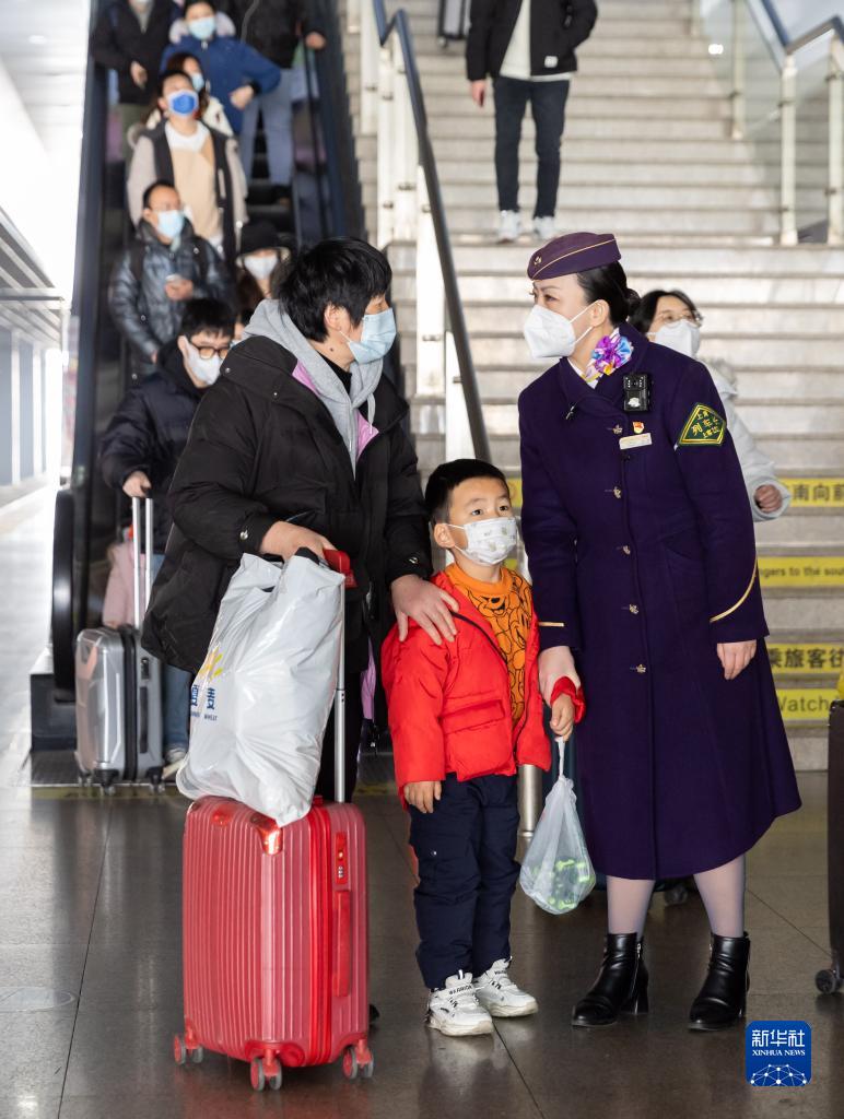 1月21日,铁路上海客运段列车长顾蓉解答一名带小孩旅客的询问。