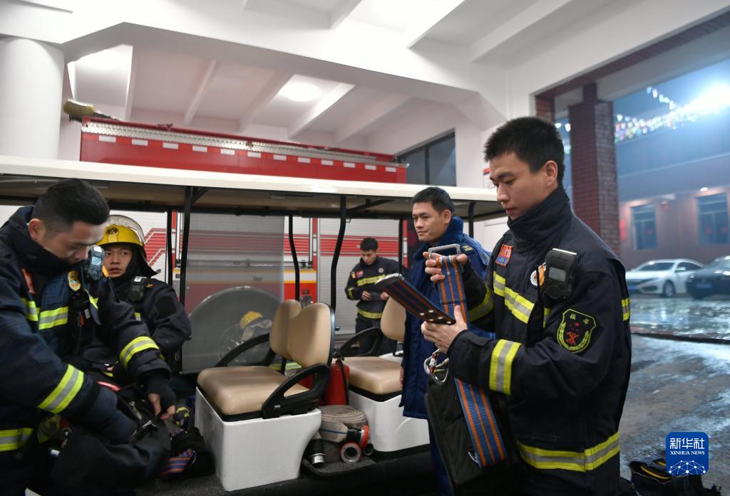 1月21日,福州市仓山区消防救援大队消防员在整理装备,准备上街巡查。