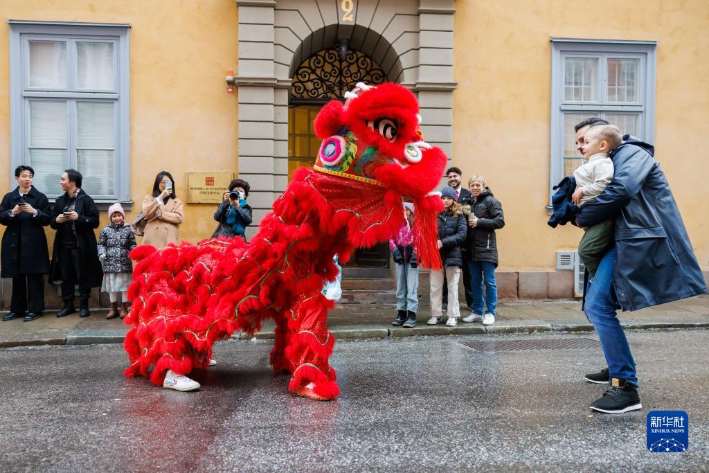 1月14日,人们在瑞典斯德哥尔摩中国文化中心外观看舞狮。