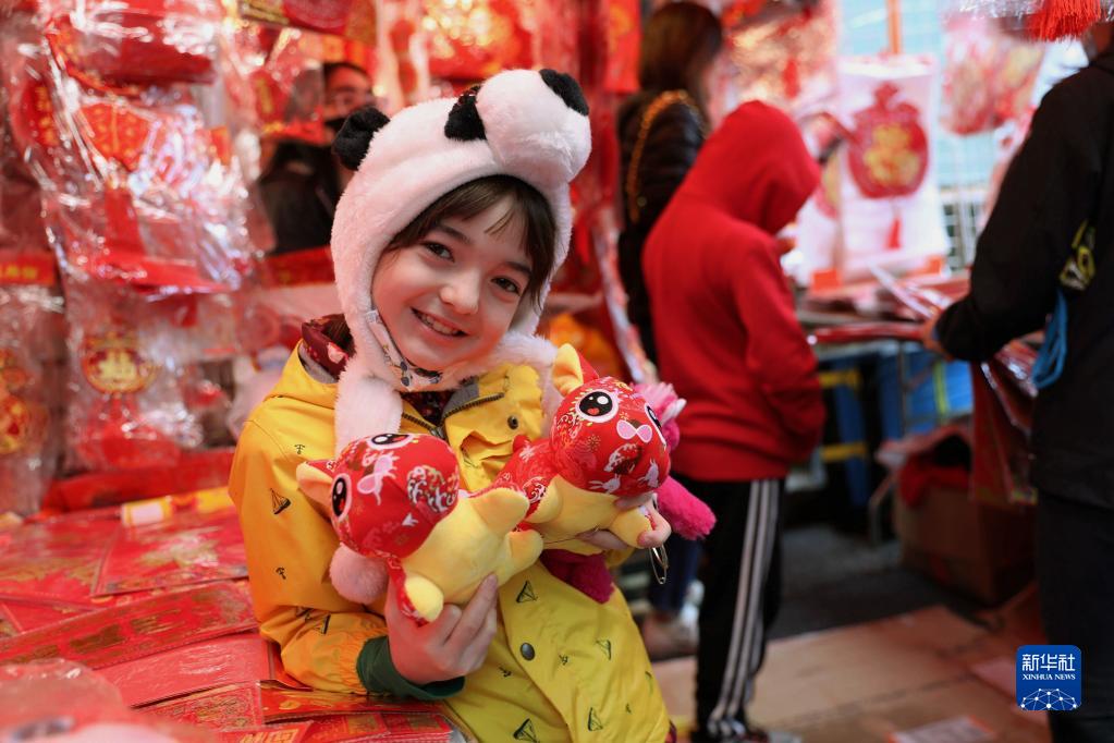 1月15日,一名女孩在美国旧金山唐人街的迎春街会上怀抱布偶。