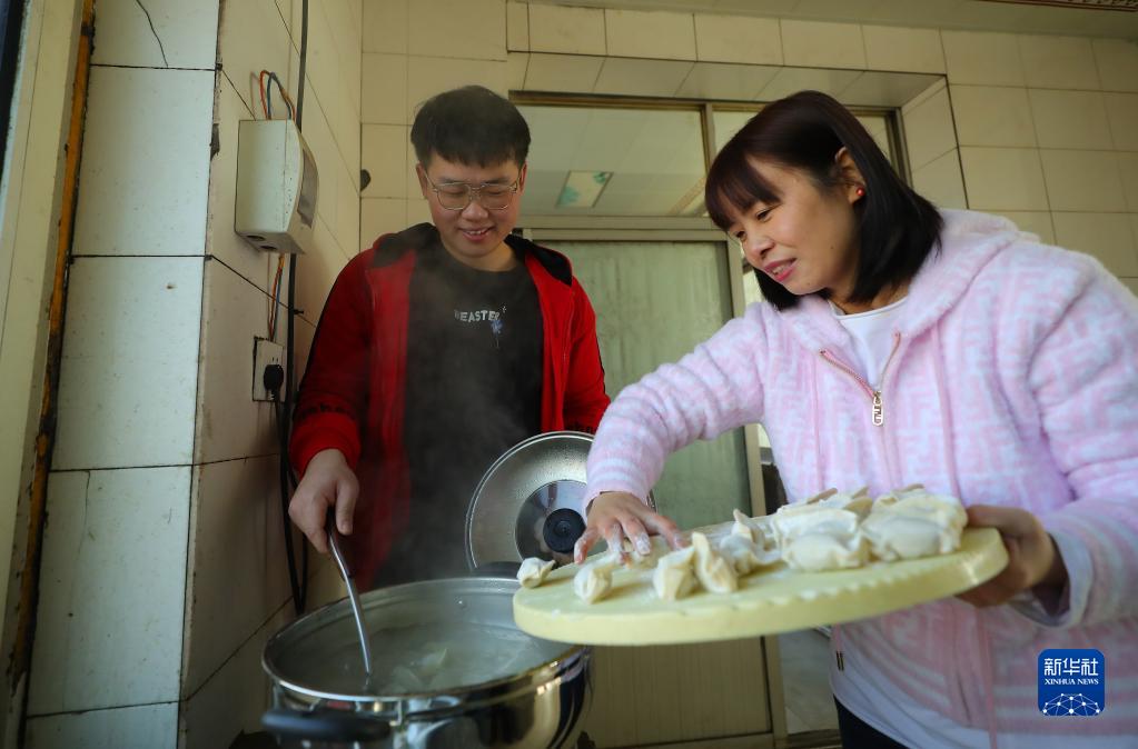 1月20日,沈阳工学院老师和李天骐(左)一起煮饺子。