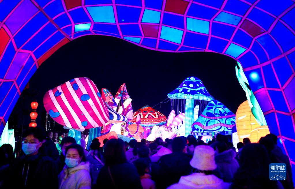 人们在西安城墙新春灯会赏灯游玩(1月20日摄)。