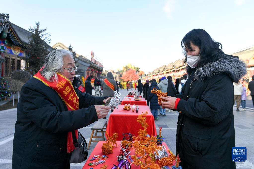 1月21日,非遗传承人贾茂田(左)在恼包村美食街向游客介绍金属丝编织技艺。