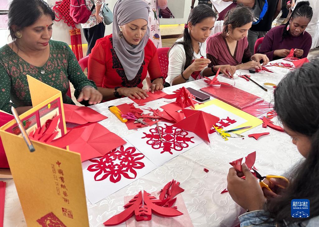 1月18日,中国文化爱好者在毛里求斯首都路易港体验中国剪纸。
