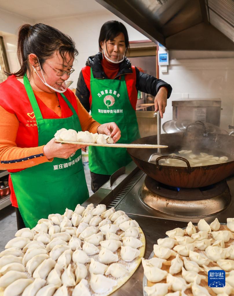 1月21日,在山东省荣成市夏庄镇甲夼马家村暖心食堂,志愿者煮饺子。