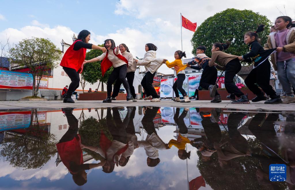 1月13日,江西省新余市渝水区珠珊镇花田村画溪书院,孩子们在志愿者组织下参与趣味游戏,享受快乐寒假。