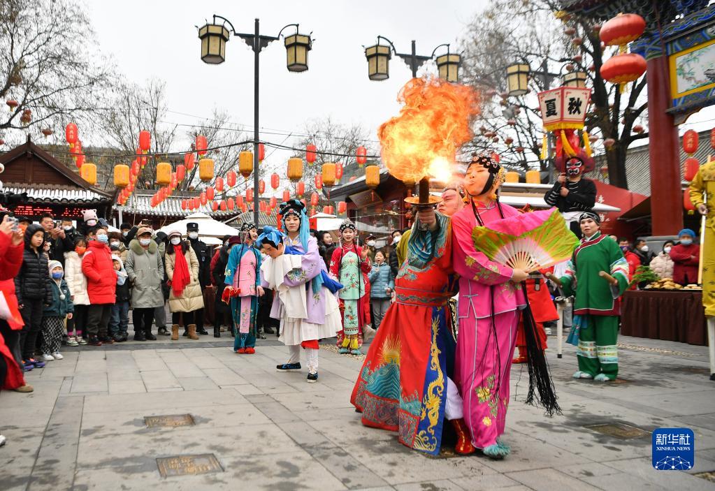 1月14日,演员在陕西省西安市新城区永兴坊景区表演传统社火。市民游客在感受传统文化中迎接新春佳节。