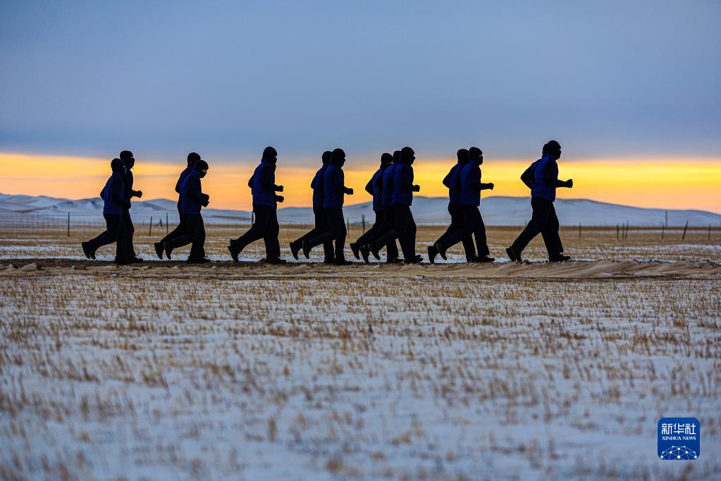1月7日,西乌珠穆沁旗消防救援大队的消防员们在雪地上跑步训练。