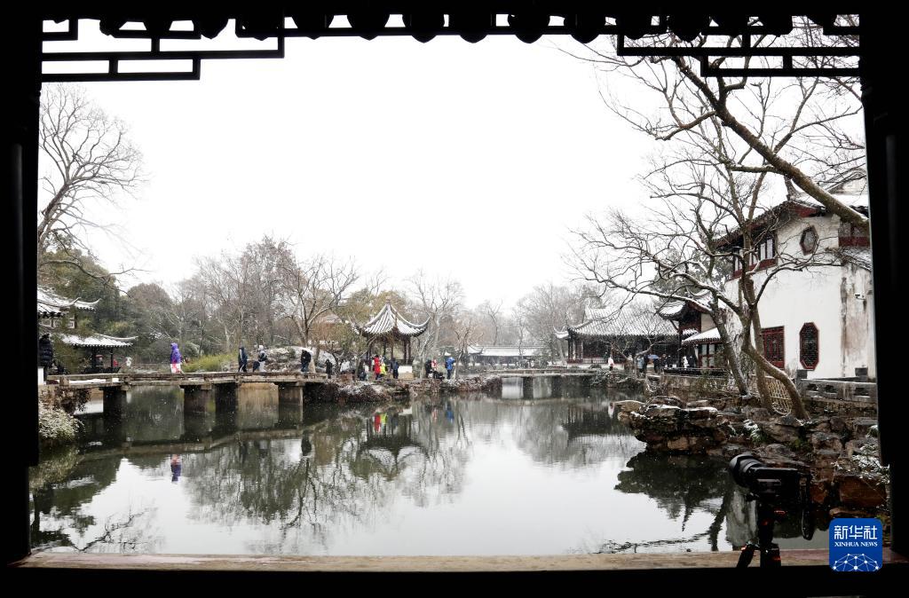 1月15日,游客在江苏苏州拙政园观赏雪景。