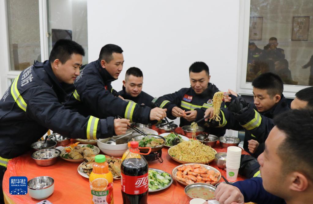 1月21日,在福建省龙岩市消防救援支队,消防队员在吃年夜饭。