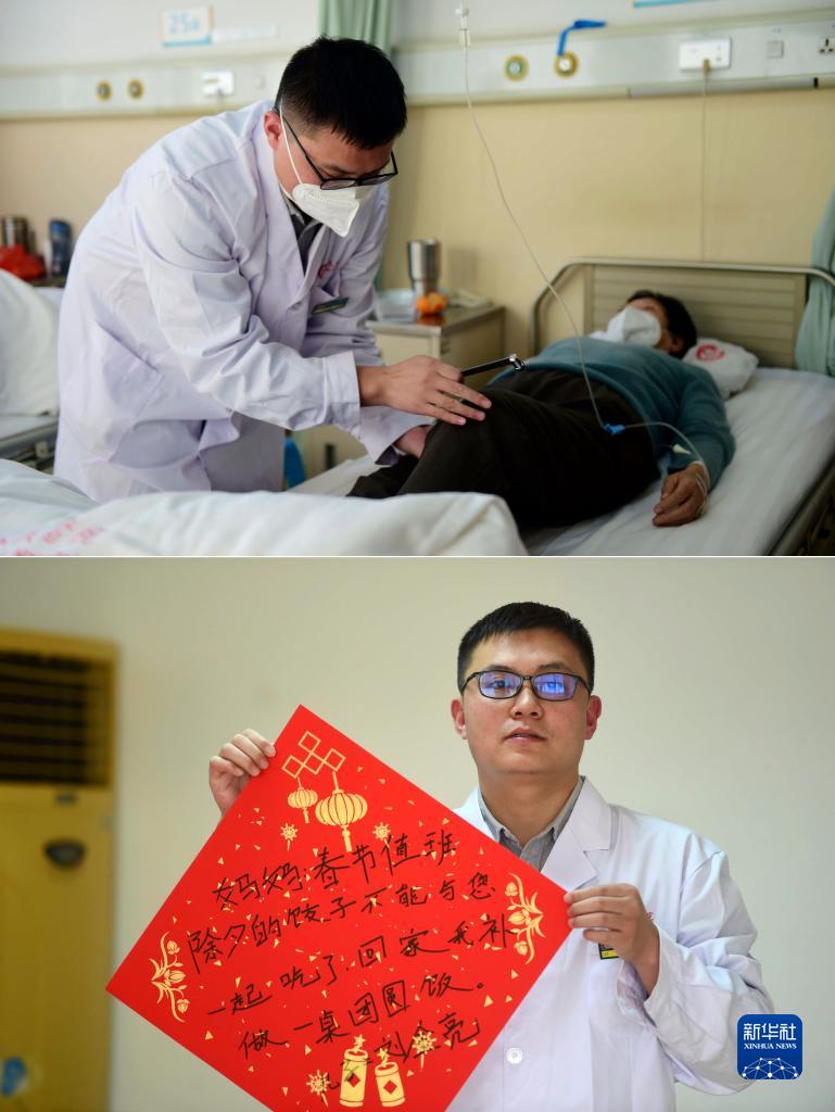 拼版照片:1月21日,沧州市人民医院神经内七科医生刘全亮在病房为患者做检查(上图);刘全亮写的“致歉语”:“妈妈:春节值班,除夕的饺子不能与您一起吃了,回家我补做一桌团圆饭”(下图)。
