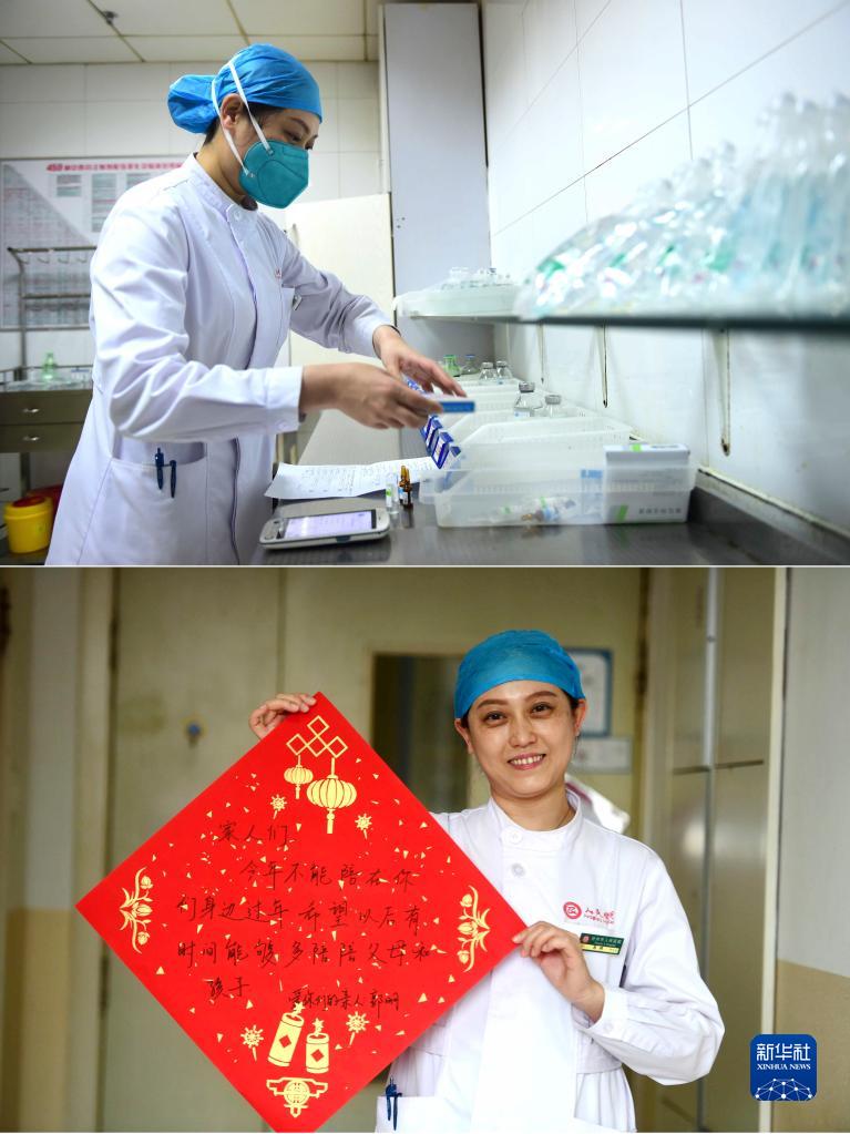 拼版照片:1月21日,沧州市人民医院骨四科护士郭明在为患者配药(上图);郭明写的“致歉语”:“家人们:今年不能陪在你们身边过年,希望以后有时间能够多陪陪父母和孩子”(下图)。