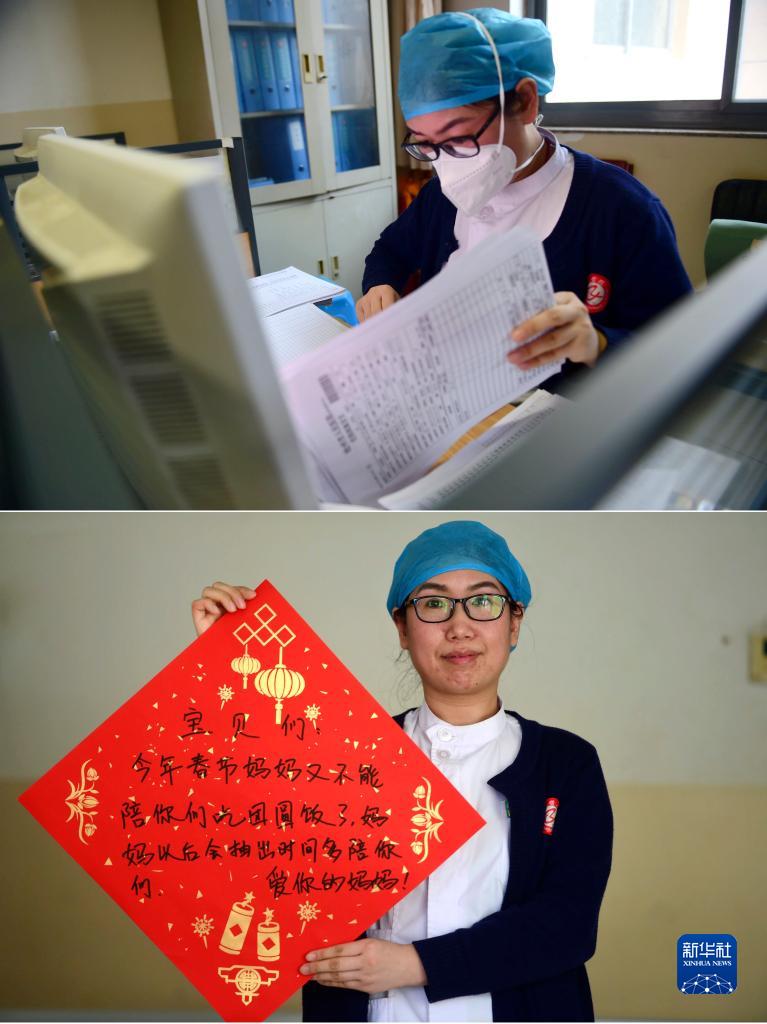 拼版照片:1月21日,沧州市人民医院创伤脊柱骨科护士周丽在整理患者病历(上图);周丽写的“致歉语”:“宝贝们:今年春节妈妈又不能陪你们吃团圆饭了,妈妈以后会抽出时间多陪你们”(下图)。