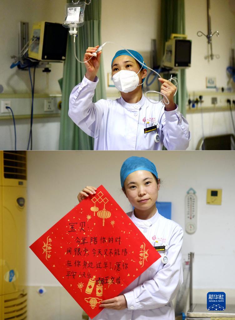 拼版照片:1月21日,沧州市人民医院神经内七科护士王文婧在为患者输液(上图);王文婧写的“致歉语”:“宝贝:今年陪你的时间很少,今天又不能陪在你身边过年了,愿你平安快乐”(下图)。
