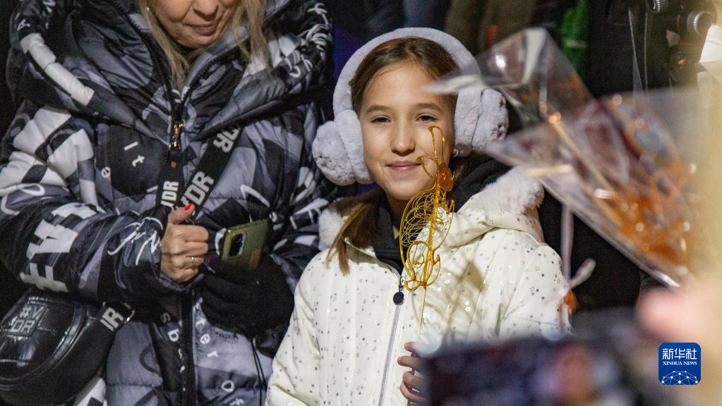 1月21日晚,在塞尔维亚首都贝尔格莱德举行的“欢乐春节——丝绸之路上的友谊大篷车”活动上,一名塞尔维亚儿童手举兔子图案的糖画。