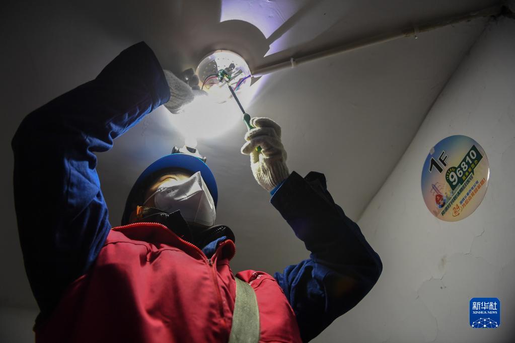 1月21日,在吉林长春南关区全安街道塘子社区,国网长春市南关区供电公司共产党员服务队队员孙胜在检修楼道灯。