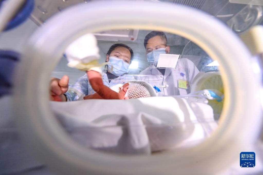 1月22日,在贵州省铜仁市玉屏侗族自治县人民医院新生儿科,医护人员在护理新生儿。