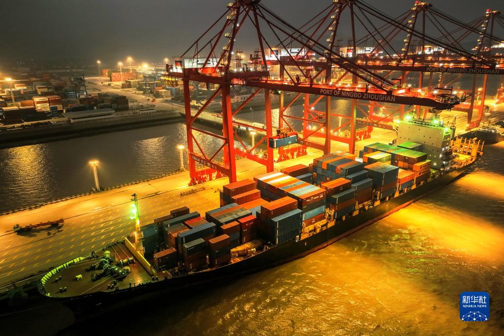 1月22日晚, “盛城”号集装箱班轮在浙江宁波舟山港金塘港区作业(无人机照片)。