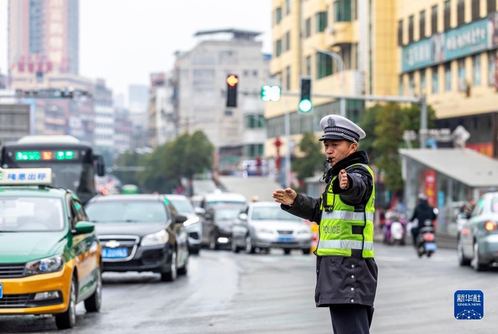 1月21日,交警在湖南省隆回县桃洪中路指挥交通。