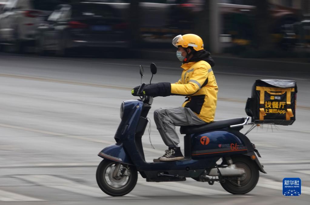 1月21日,在广西南宁市高新区科德新苑路口,一名外卖小哥驾驶摩托为顾客送餐。
