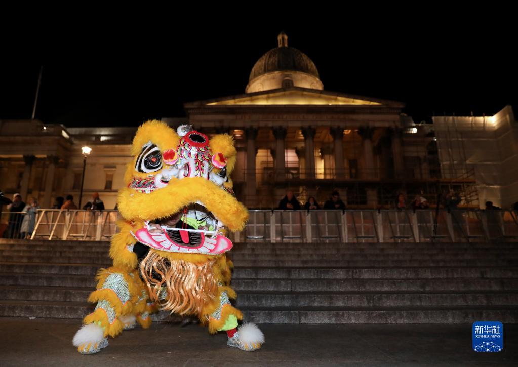 1月21日晚,演员在英国伦敦特拉法加广场表演舞狮。