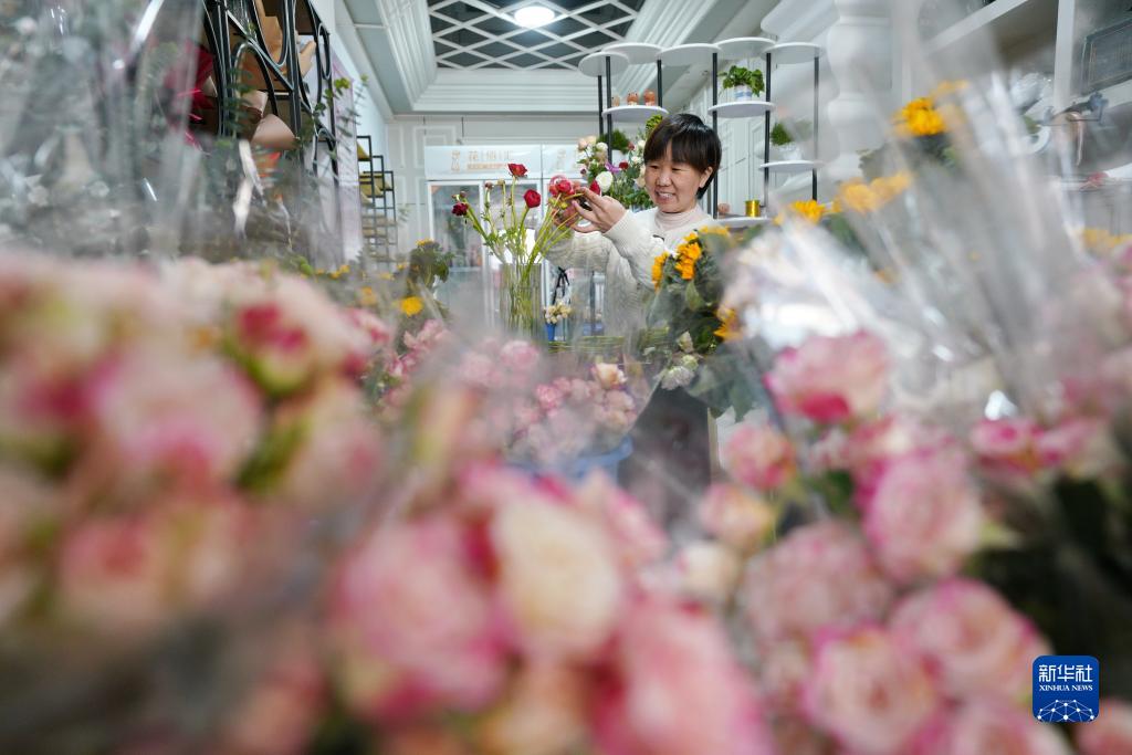 1月22日,河北省邢台市襄都区一处艺术工艺品店的工作人员在整理鲜花。