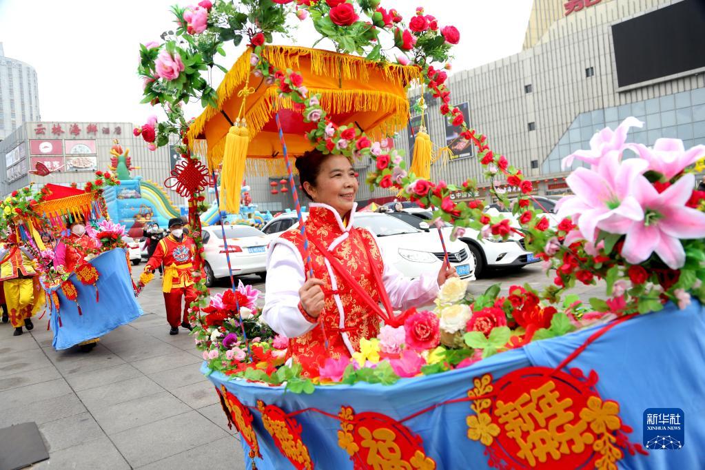1月22日,民间艺人在江苏省连云港市连云区表演“划旱船”。