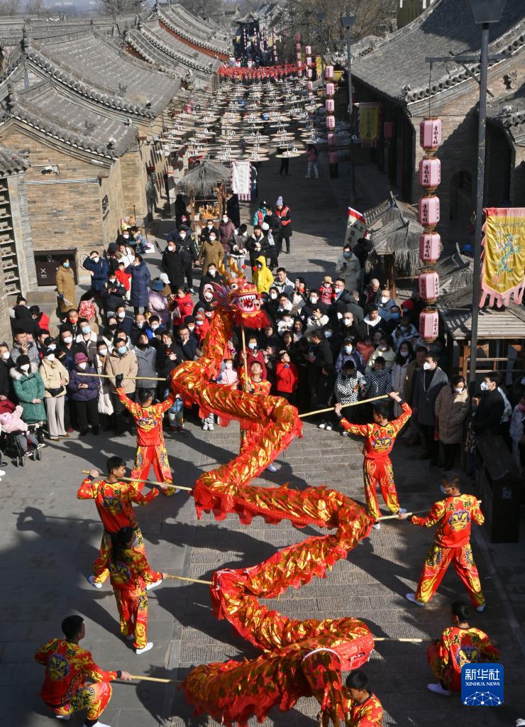 1月22日,游客在山西省阳曲县青龙古镇内观看舞龙表演。