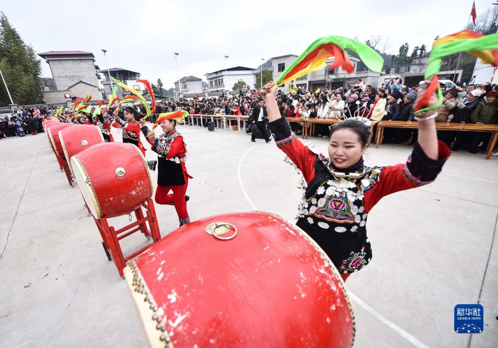 1月22日,在贵州省铜仁市松桃苗族自治县正大镇麻塘村,苗族同胞身着节日盛装打花鼓庆新春。