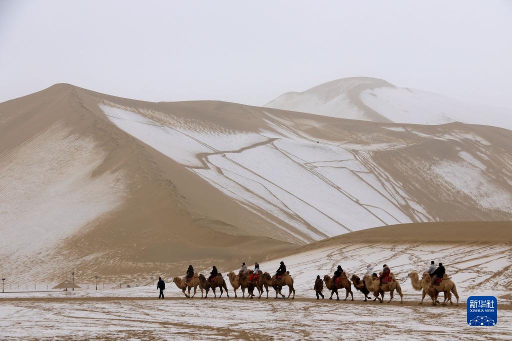 1月22日,游客在甘肃省敦煌市鸣沙山月牙泉景区游览。