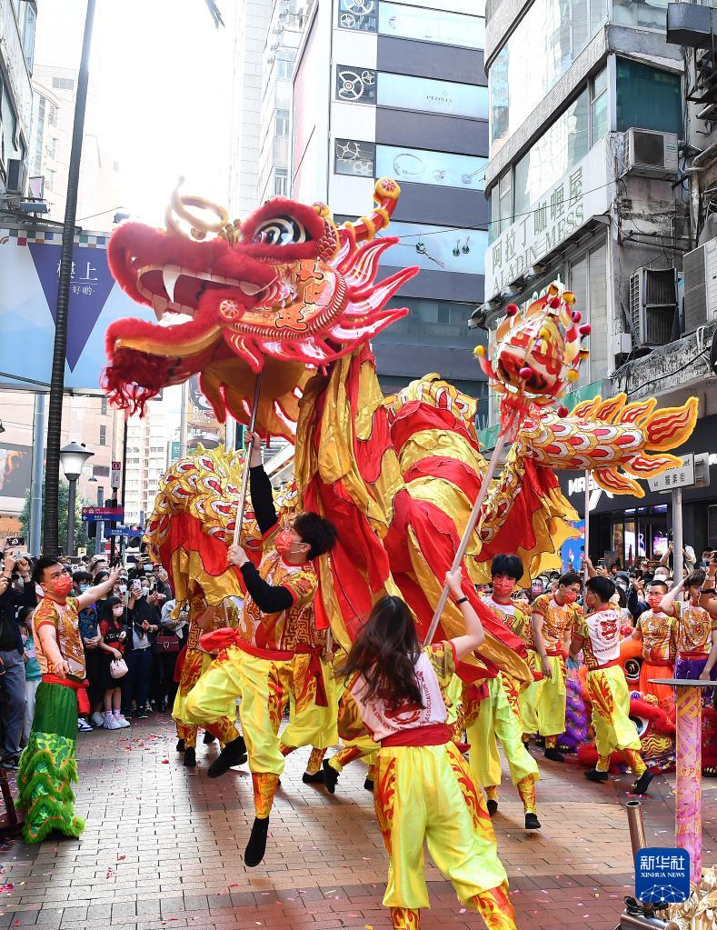 1月22日,香港湾仔街头举行舞龙表演,庆贺新春。