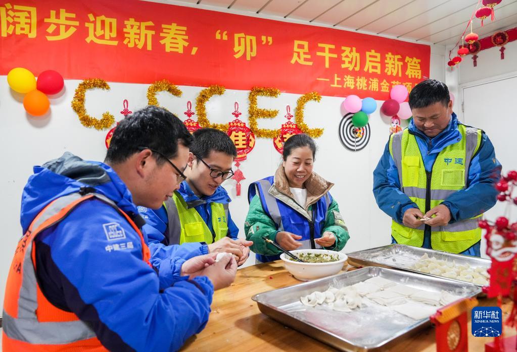 1月22日,建设者们在中建三局一公司上海桃浦金茂项目现场一同包饺子。
