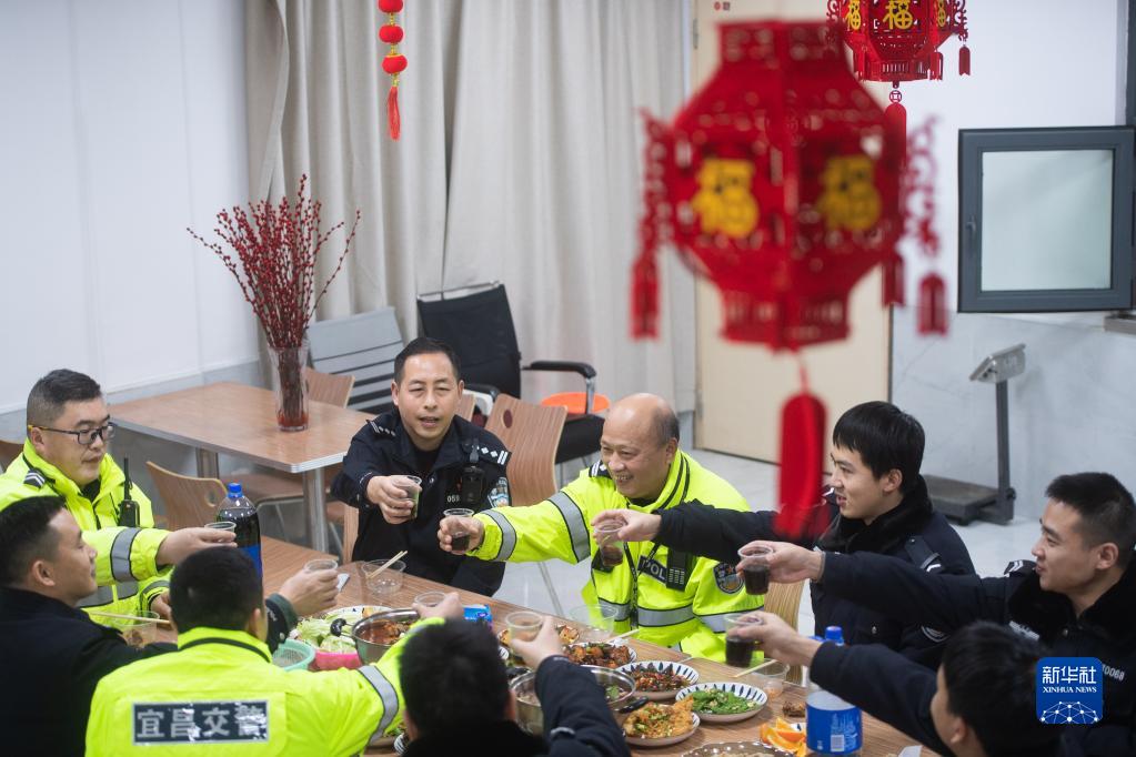 1月21日除夕夜,梅大顺(中)与值班的民警、辅警在湖北省宜昌市东山派出所食堂吃年夜饭。