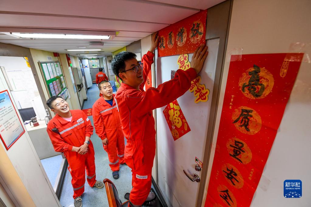 1月20日,工作人员在钻井平台的生活区张贴春联。