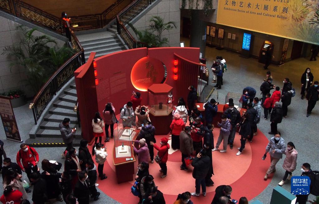 1月22日,观众在上海博物馆大堂里观看兔年迎春展。