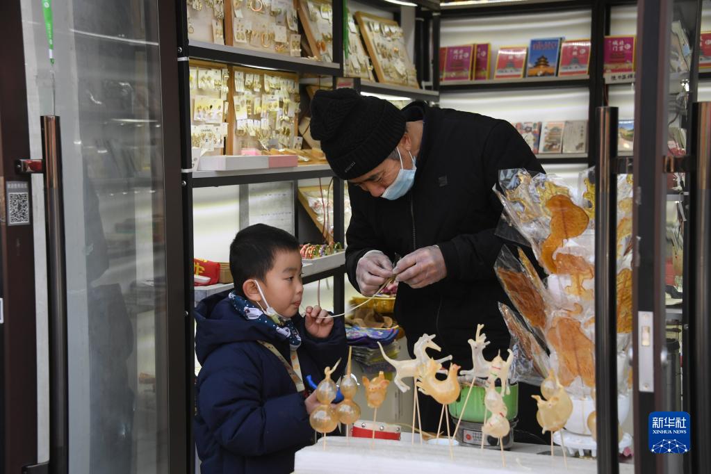 1月22日,在北京烟袋斜街的一家店铺,小朋友体验吹糖人。